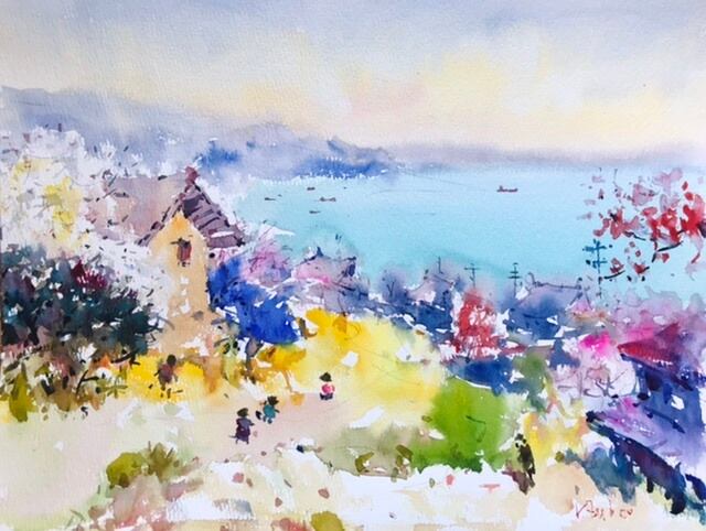 のどかで穏やかな瀬戸内海。春の訪れを喜ぶ杏の花と菜の花に彩られた里山が 心浮き立つ素晴らしい絵に映しとられています。