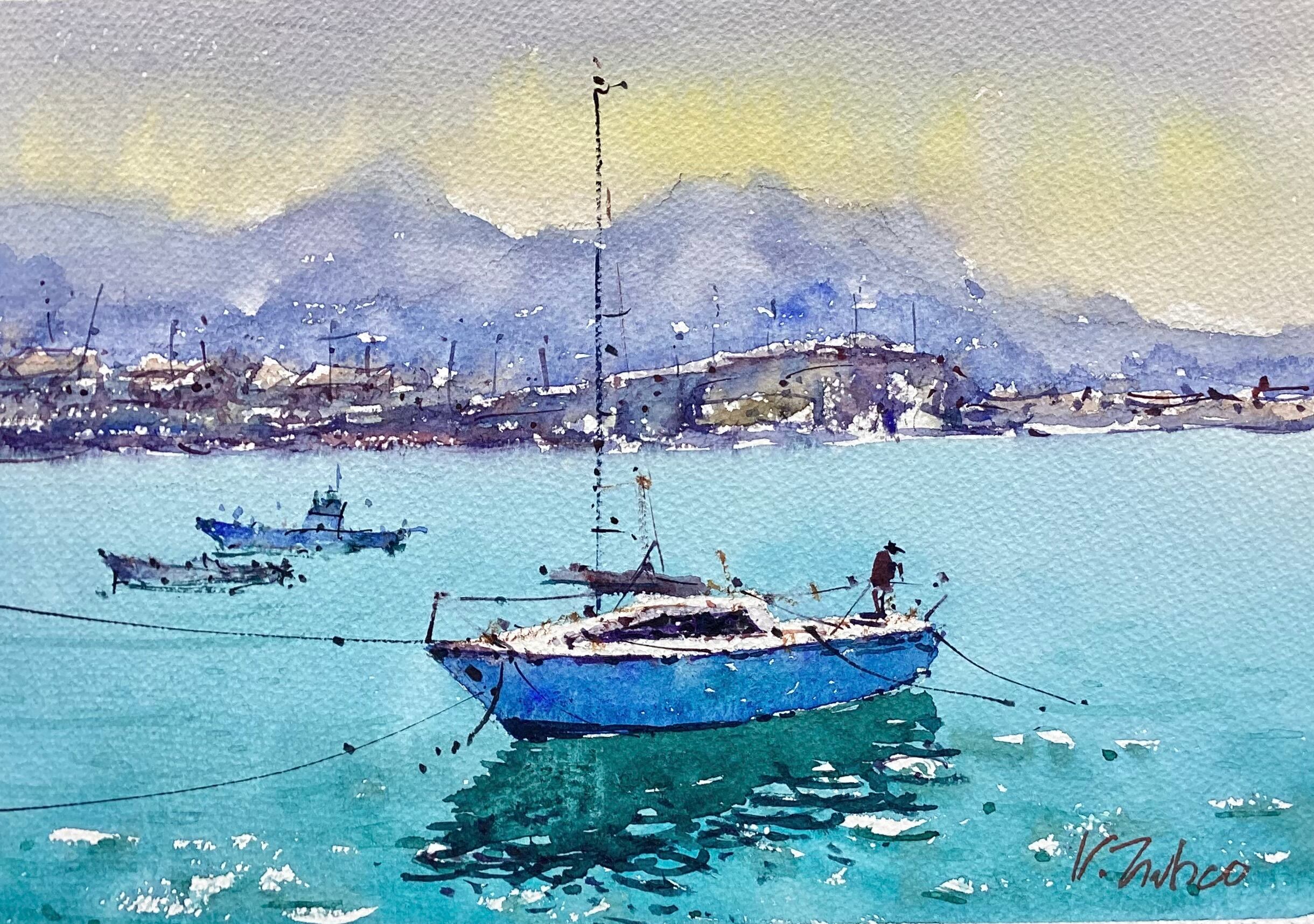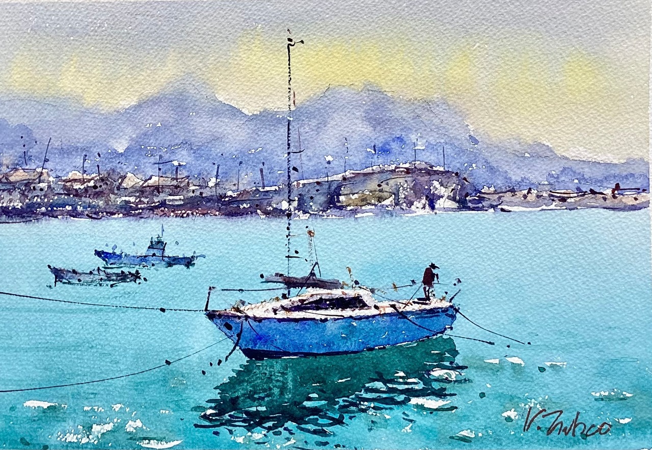 空のグラデーションが海の色と対比されて美しい。旧式の漁師の船とモダンなボートが現代と過ぎ去った日々を融合させている。